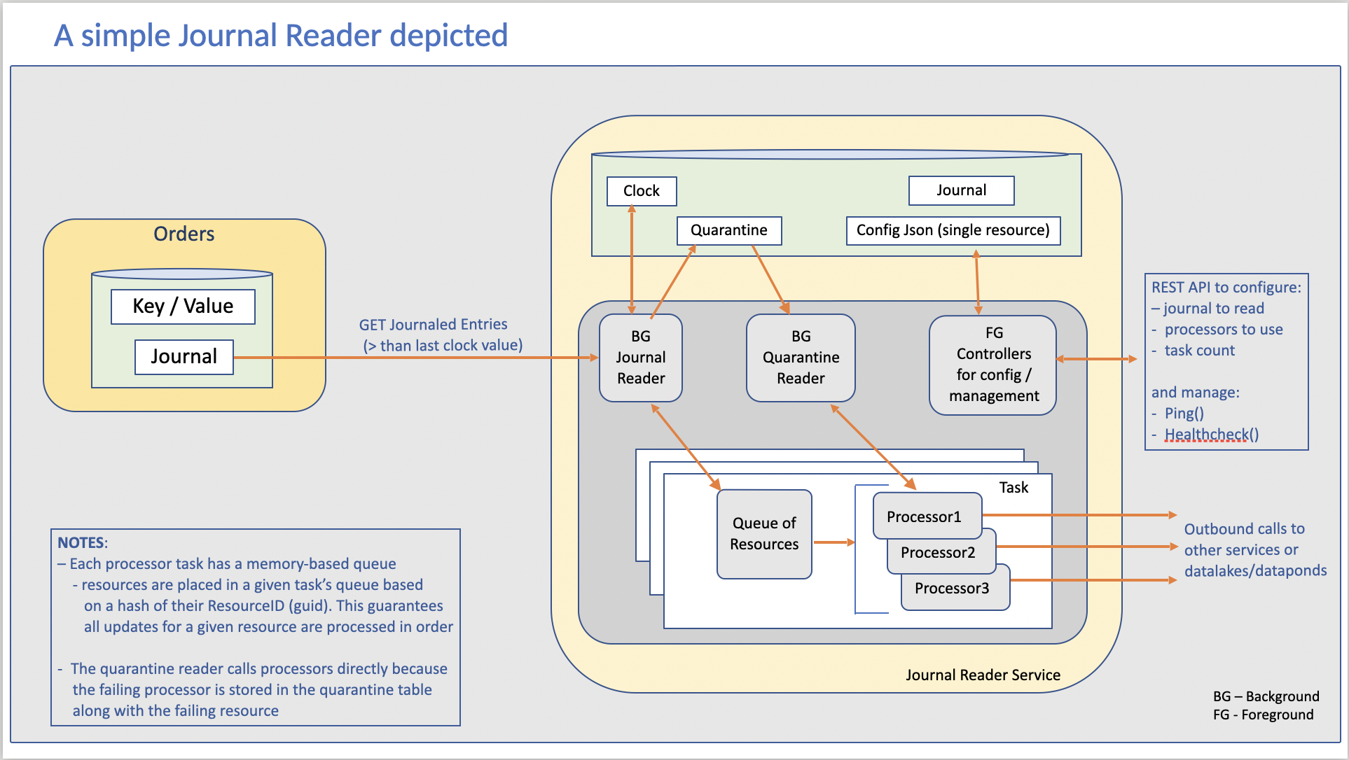 (A lower-level, implementation detail) Journal Reader processors typically run in a set of n (configured number) tasks that are spawned by the Journal Reader. Journaled resource entries (from the PULL above) being processed are divided up between the tasks using an algorithm (e.g. consistent hashing) to ensure that all updates for a given resource are processed in order.