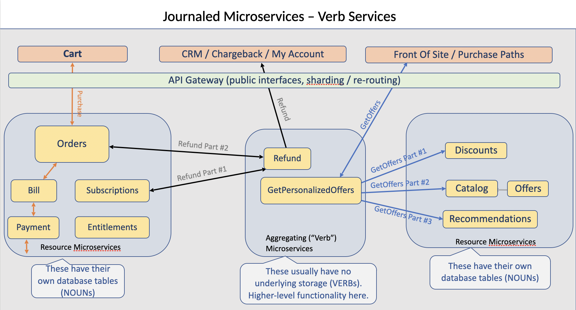 Verb services can also be used to coordinate updates spanning multiple backend services. A version of this is a verb service offering a single interface that, when called, makes multiple backend calls to do related updates..